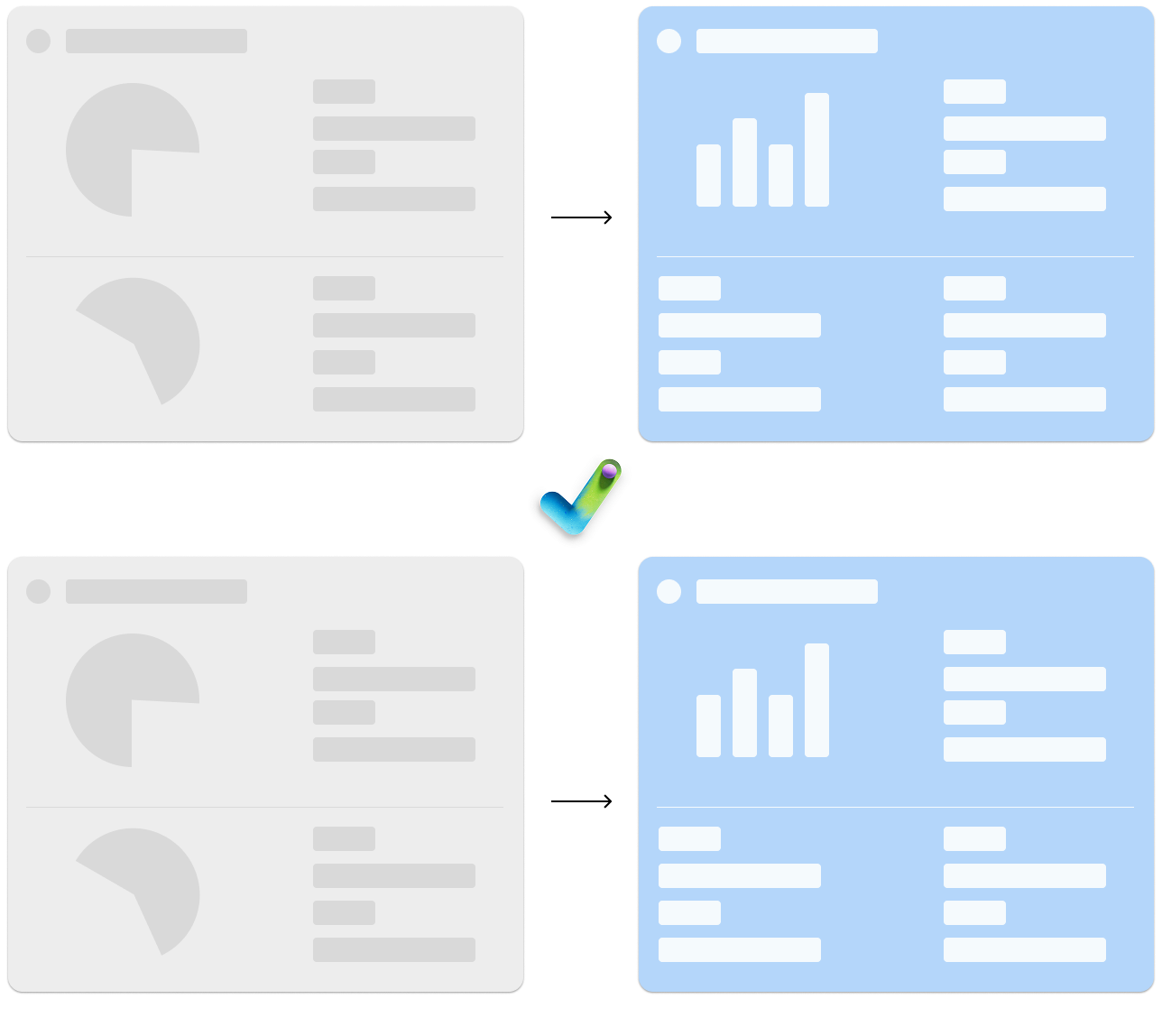 3. Be very selective with data visualization: Since data charts always draw people’s attention first, I want to be very selective so it doesn’t become too overwhelming and cause abandonment. After many discussions, I hand picked 4 data types that are critical with “progress“ and “time“ which illustrate better with visualization than text.